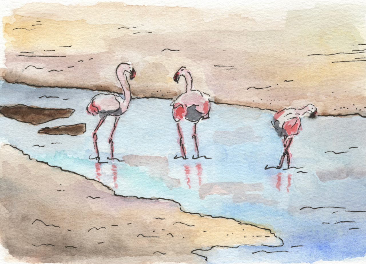 A group of Greater Flamingos tip-toed in the blue water just outside the salt pans. Their long necks curved down as they swooshed their big beaks in the waters to feed. Different from the all-over coral pink American Flamingos I’d seen in the Caribbean and Yucatan peninsula, Greater Flamingo bodies were mostly white with hints of pink. But when they took flight the jellybean pink underneath their wings was unmistakable and punctuated the sky as if a flower bloomed wide open against the clouds.