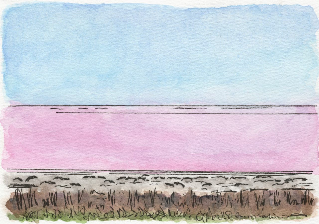 From the parking lot overlook, I scanned the pink water, sectioned off into blocks, creating a grid that covered a couple hundred hectares. These salt pans held water from the Mediterranean Sea, left to evaporate under the sun until the salt grew denser and denser. In late summer, after much of the water has vanished, sauniers (salt workers) harvest the salt—a practice more than 2000 years old.